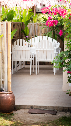 The bungalow offers a private terrace with an outdoor seating area, perfect for enjoying the shade and garden views. Inside, the room is designed with modern décor and equipped with air-conditioning, fan, a fridge and a small pantry, as well as a safety box for a comfortable and relaxing stay.