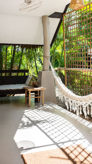 The bungalow offers a private terrace with a hammock and outdoor seating area, perfect for enjoying the shade and garden views. Inside, the room is designed with modern décor and equipped with air-conditioning, fan, mini fridge and safety box for a comfortable and relaxing stay.